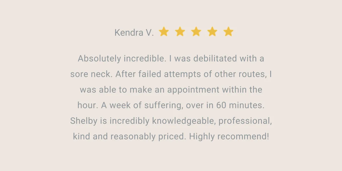 Absolutely incredible. I was debilitated with a sore neck. After failed attempts of other routes, I was able to make an appointment within the hour. A week of suffering, over in 60 minutes. Shelby is incredibly knowledgeable, professional, kind and reasonably priced. Highly recommend!