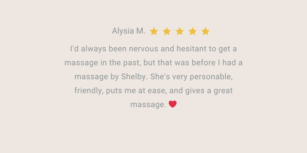 I'd always been nervous and hesitant to get a massage in the past, but that was before I had a massage by Shelby. She's very personable, friendly, puts me at ease, and gives a great massage. ❤️