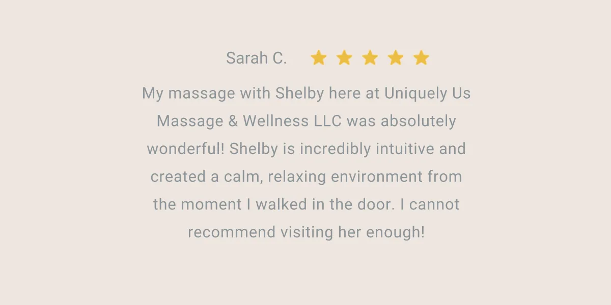 My massage with Shelby here at Uniquely Us Massage & Wellness LLC was absolutely wonderful! Shelby is incredibly intuitive and created a calm, relaxing environment from the moment I walked in the door. I cannot recommend visiting her enough!
